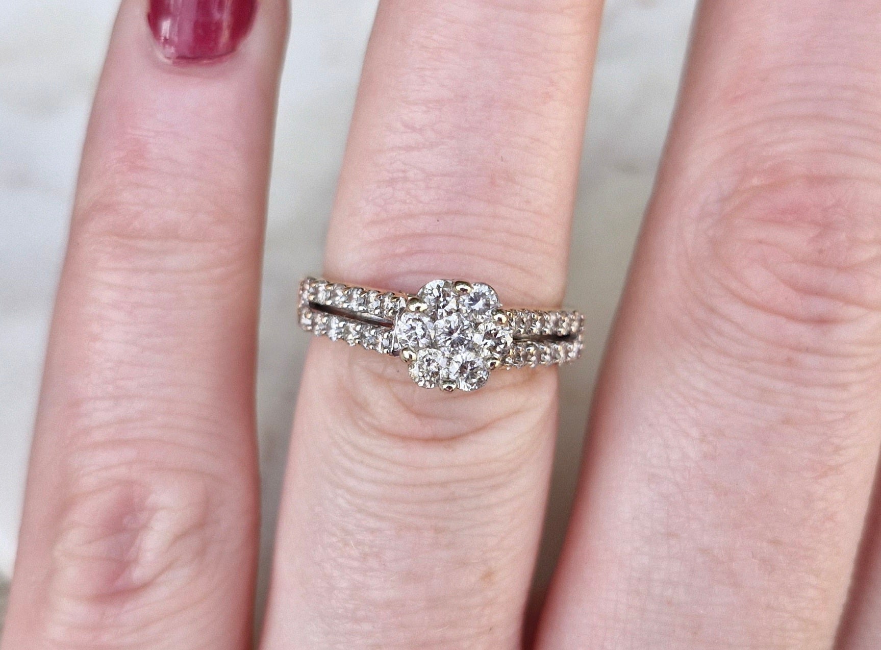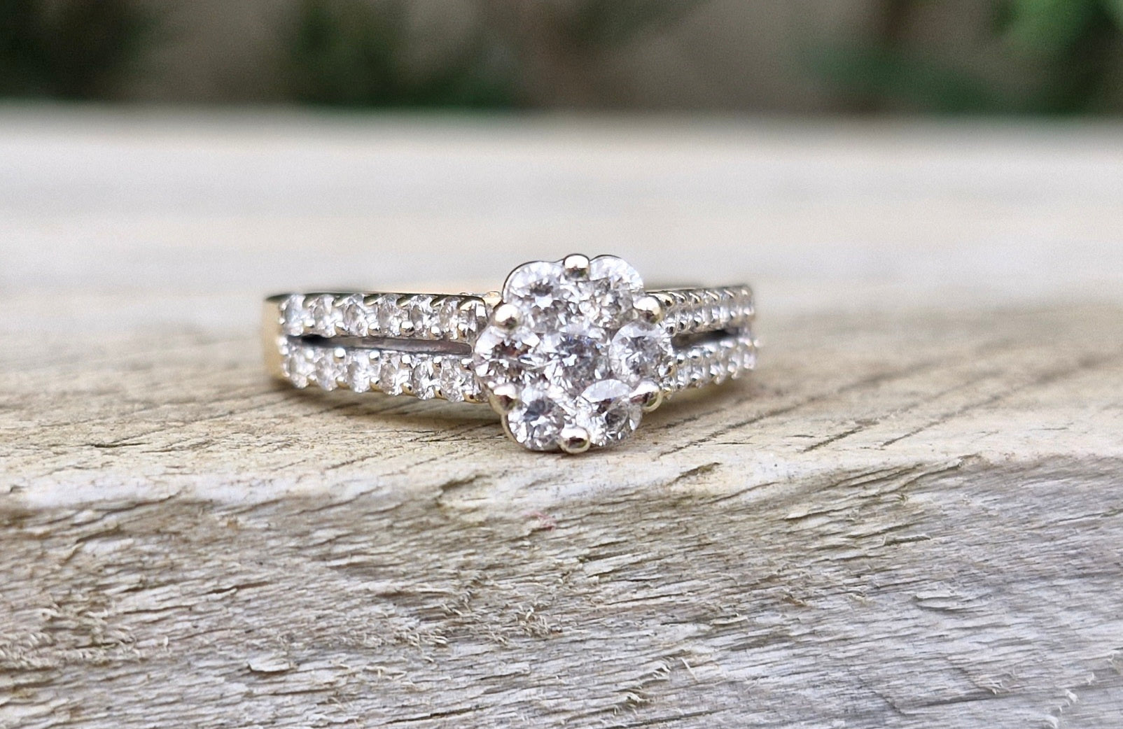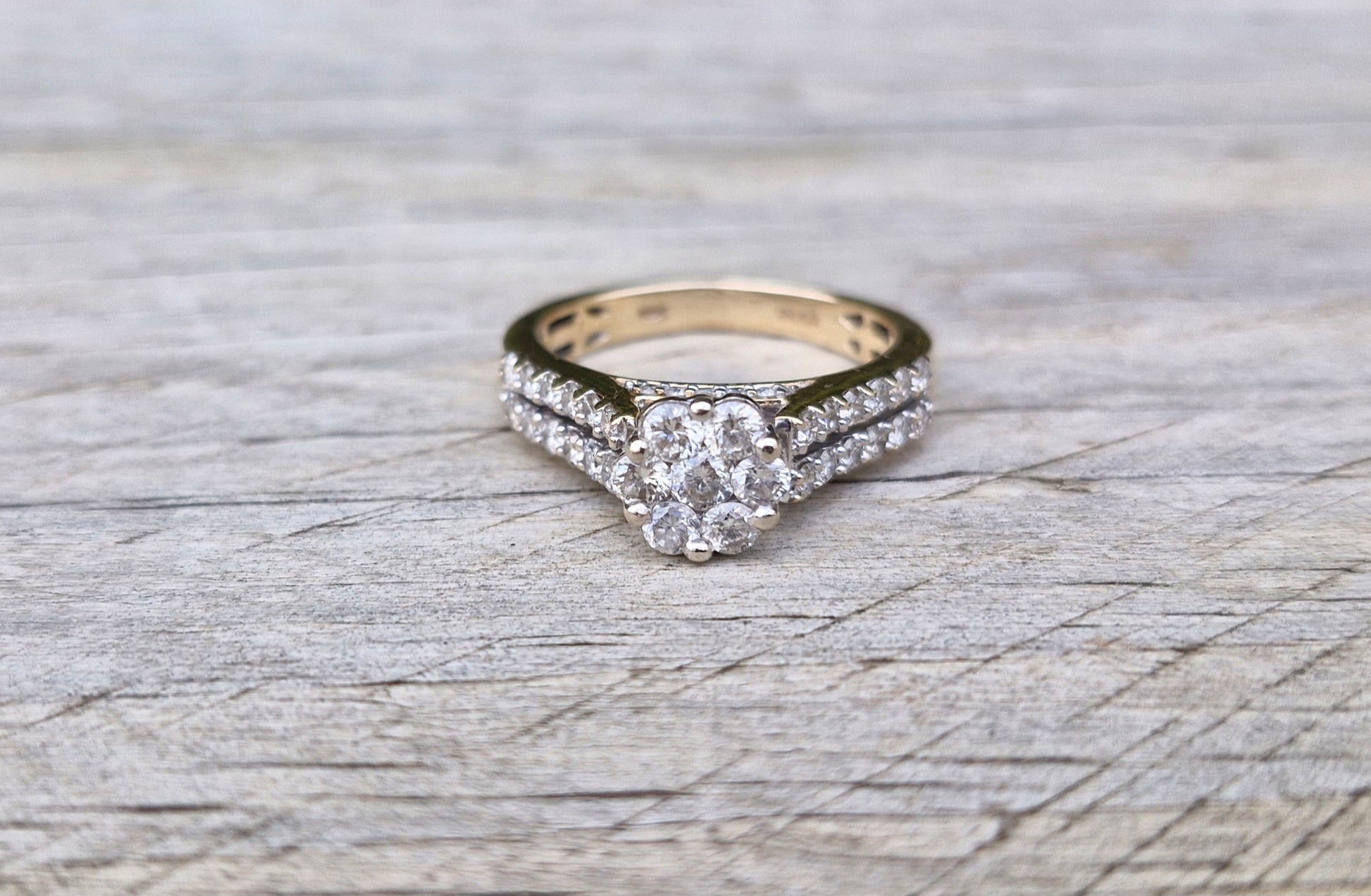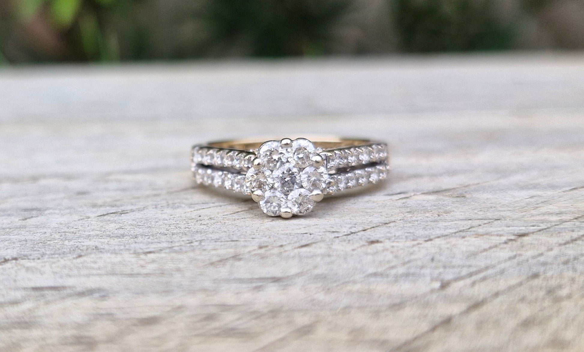 This 10ct gold ring is has diamonds on show no matter which direction you look at it from! Genuine diamonds form a central flower shape that sits upon an elevated undercarriage. The undercarriage is further adorned by five diamonds in each side. The shoulders are a double row design with each row being studded with diamonds that encompasses the whole front of the finger. The design of this ring, paired with the think shank, feels substantial. The central diamonds measure around 2mm each, with the whole setting being 7mm diameter.