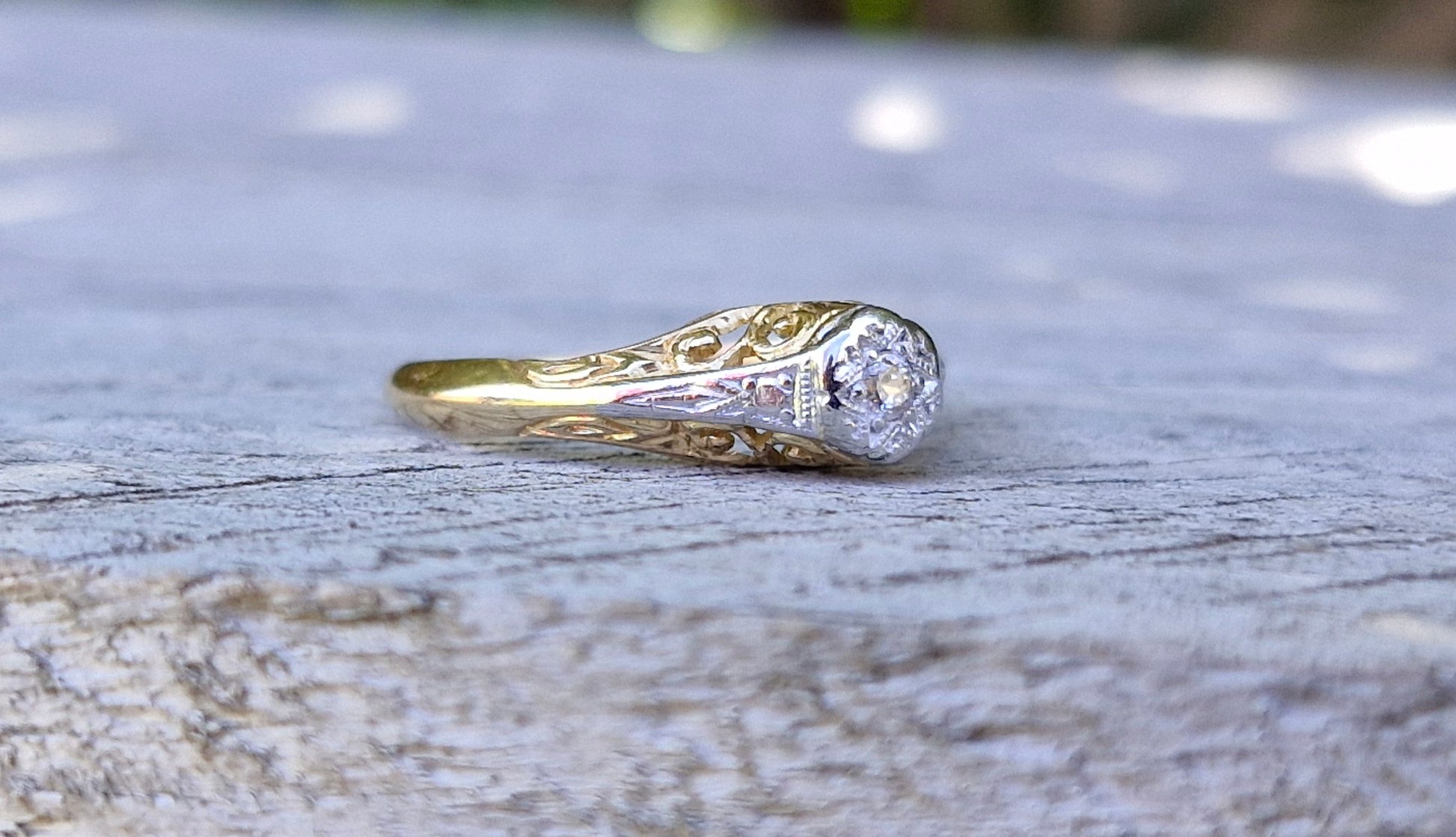 This is a sweet little vintage ring in 18ct gold. The setting and shoulders are highlighted by platinum. There is a small diamond in an illusion setting. The diamond measures around 2mm with the surrounding setting being 5mm. The handcut filigree and engraved details in the platinum are beautiful.
