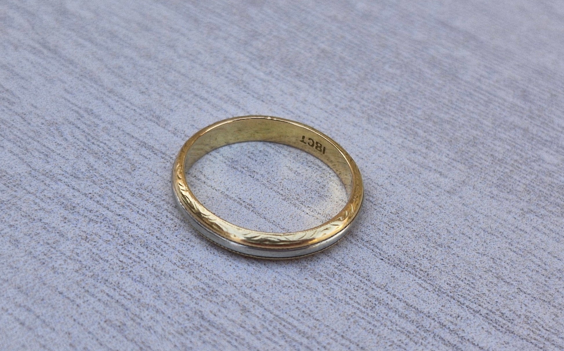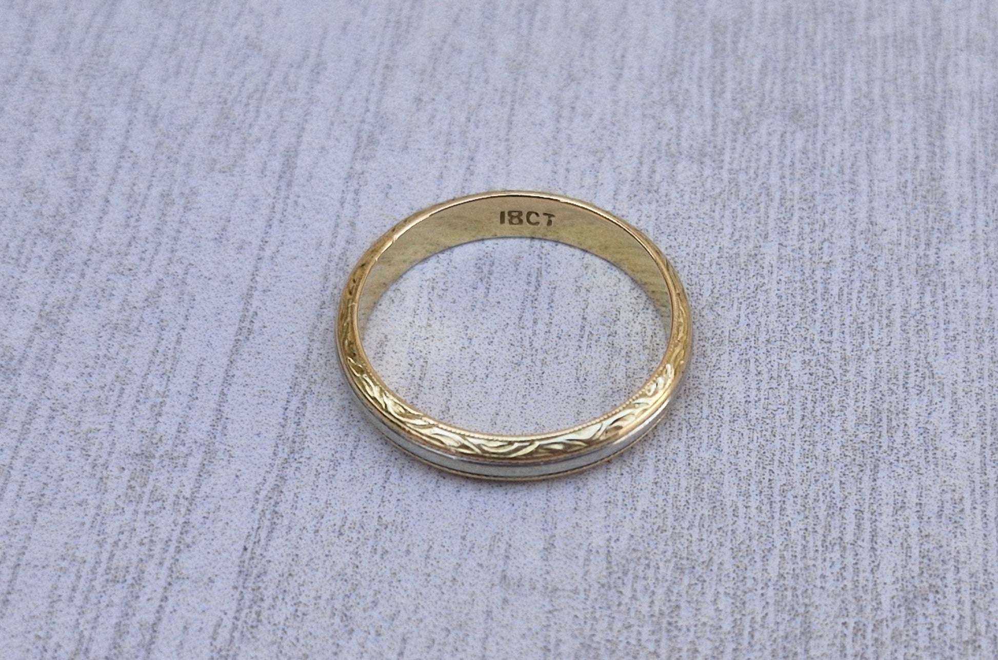 This stunning 18ct two-tone gold band is priced at scrap gold value. It has a sleek 3mm profile which showcases a central white gold band, framed by two rich yellow gold edges.