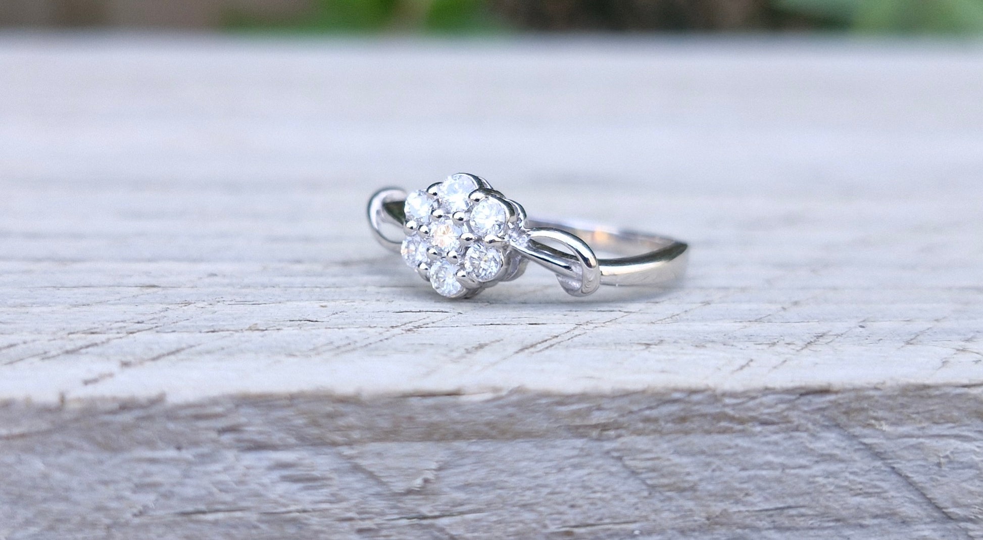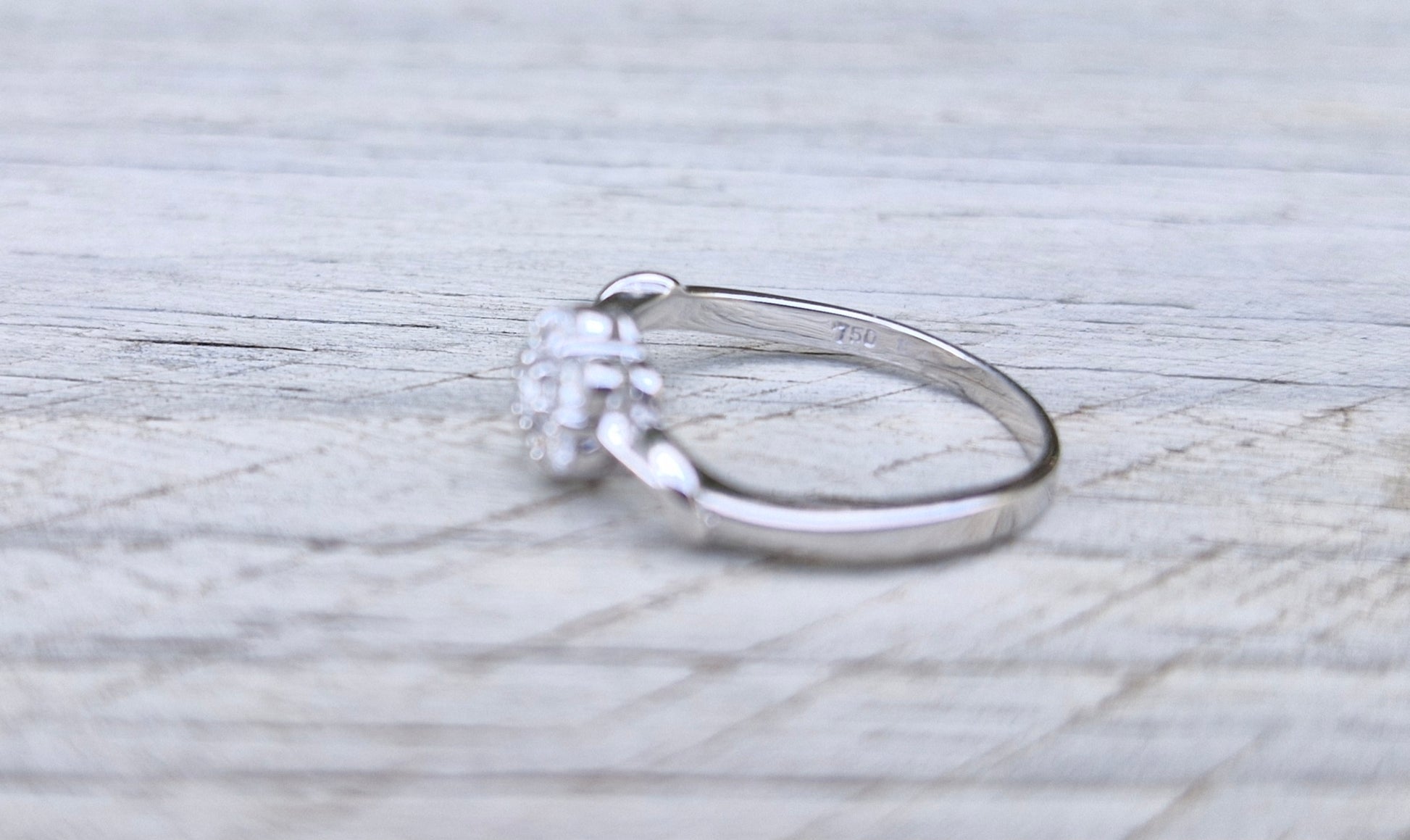We found this ring hard to photograph - the diamonds are bright white and the light just bounces off of them! The diamonds are clustered together to form the ever-so-popular daisy shape. They are claw set, in 18ct white gold, and adorned by a simple yet elegant shoulder design.