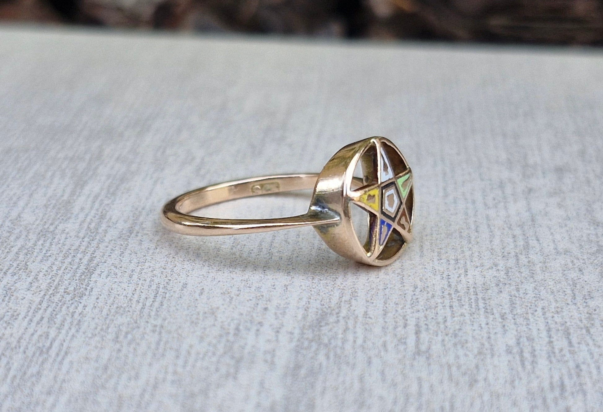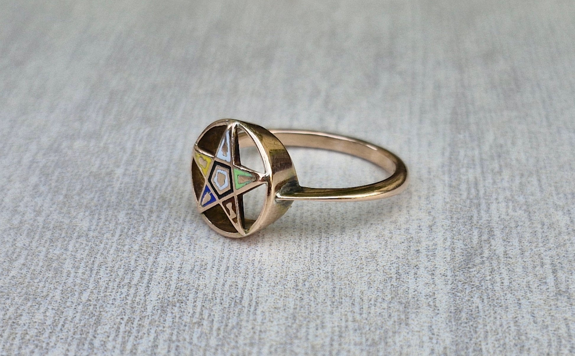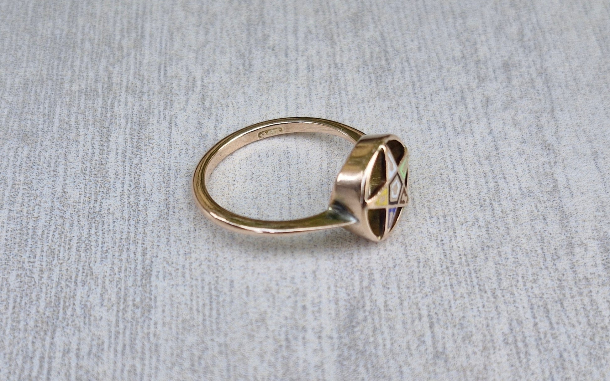 This ring is crafted from 9ct gold, which has warm rosy hue. Embedded upon a circular setting is the Order of the Eastern Star. The symbol is made up of gold inlay, set within various coloured enamels.