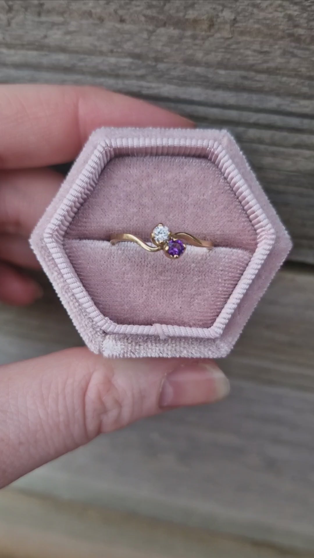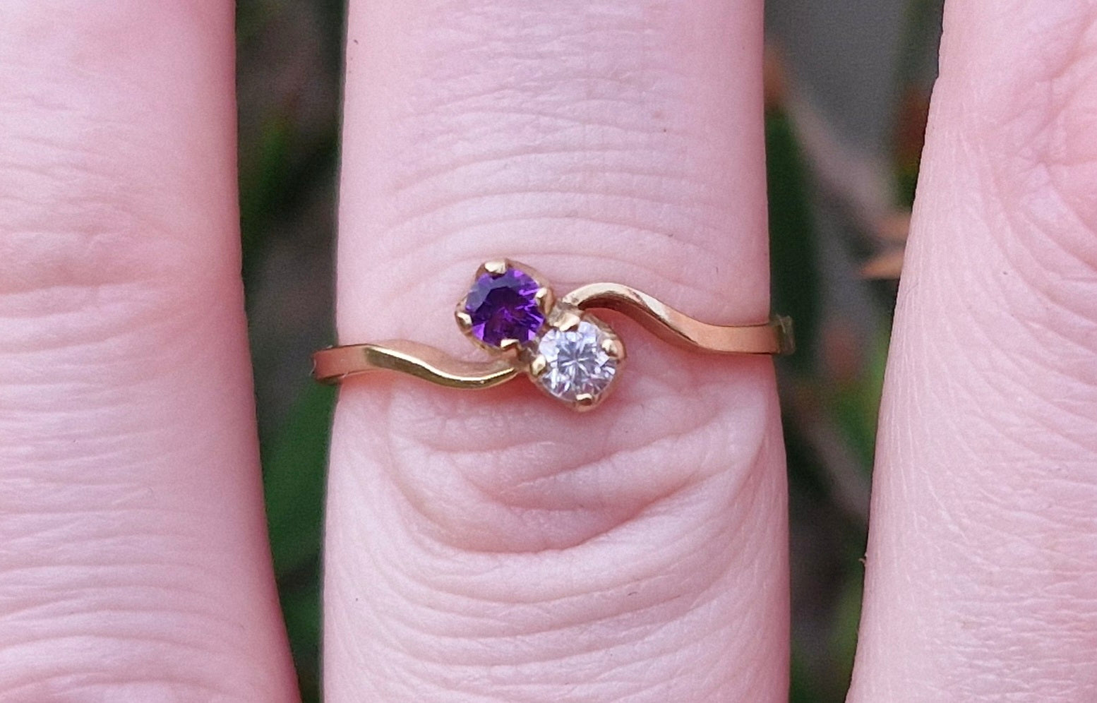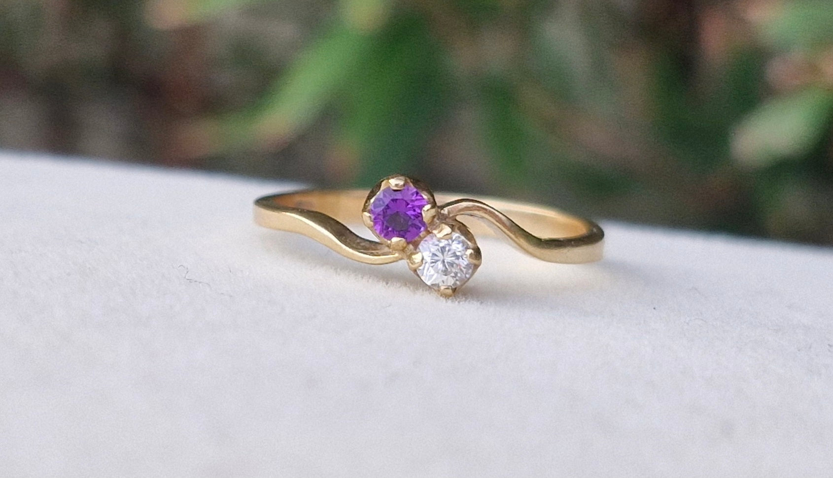 Nestled between the two stones is a tapered band that elegantly flows from one stone to the other. At first glance, the clear stone appears to be a diamond however upon testing, it is confirmed to be a created stone. The vibrant purple stone is an amethyst.