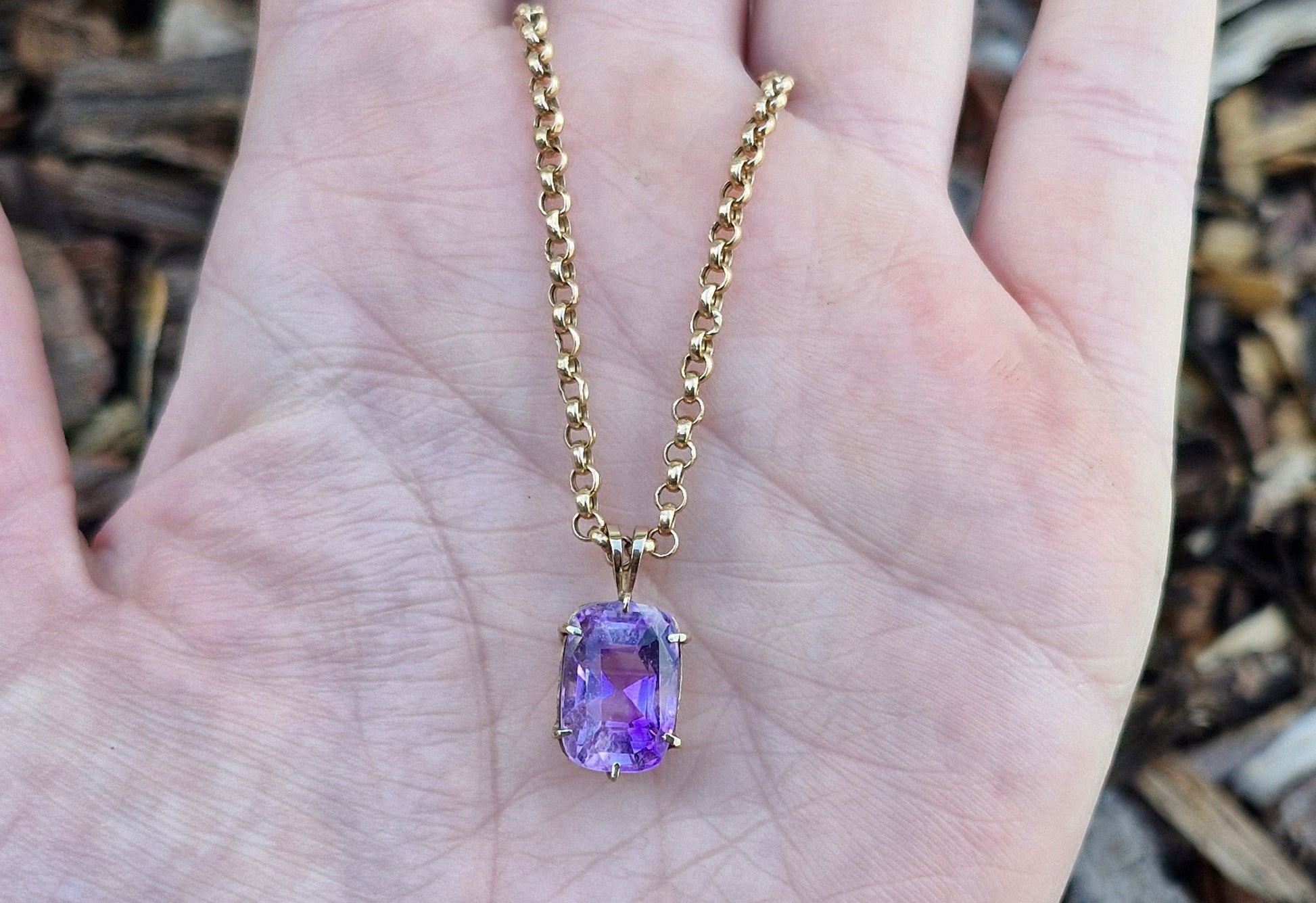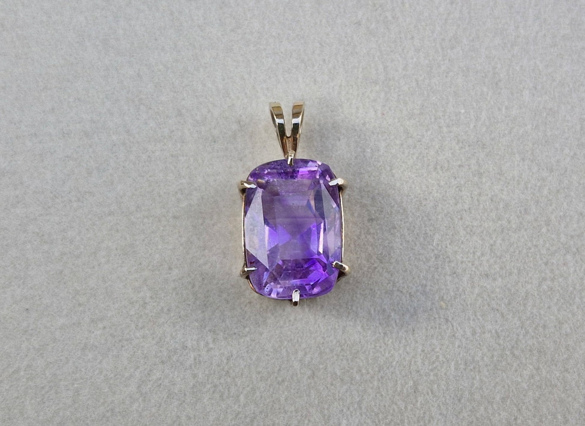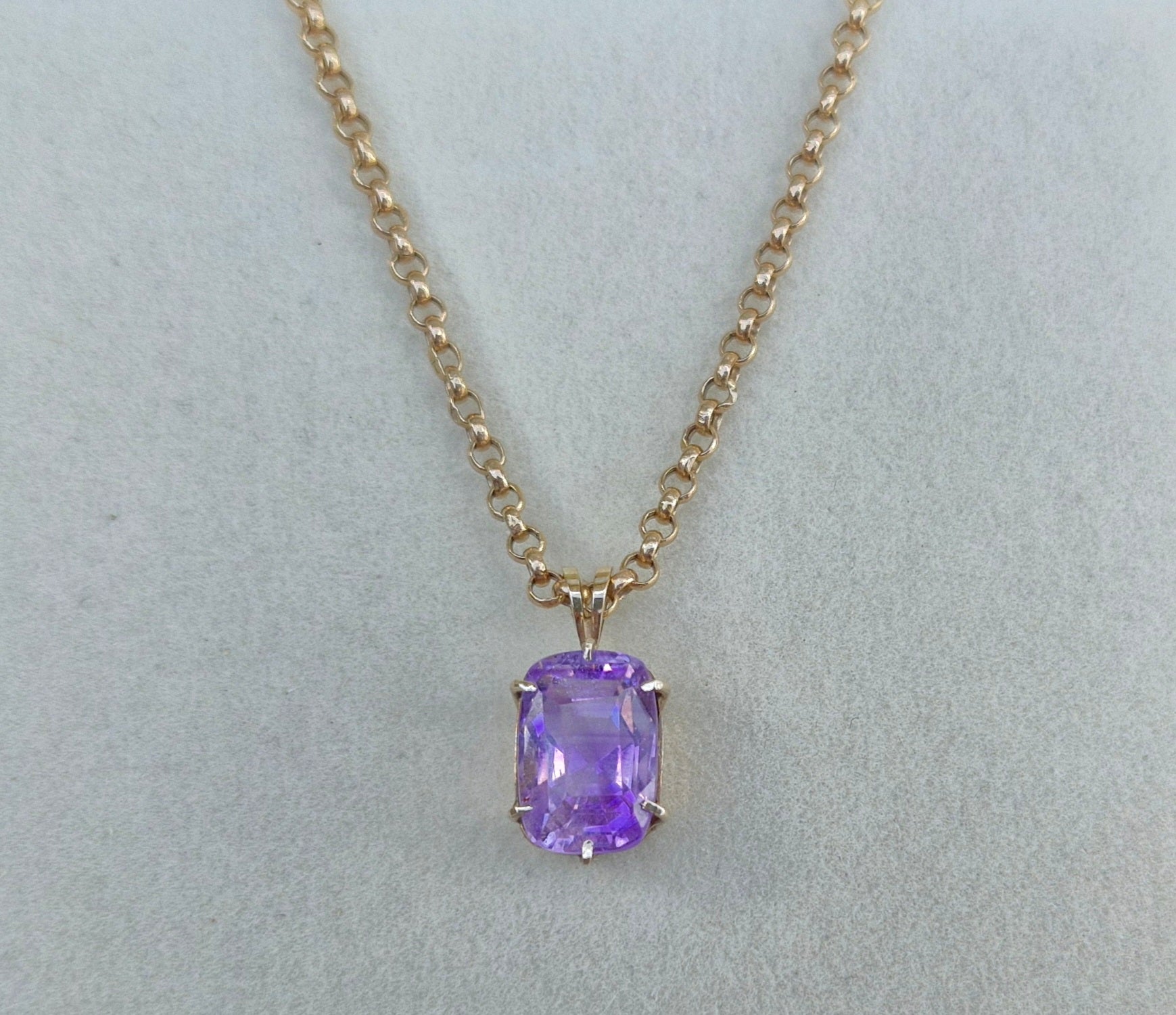 A beautiful 9ct yellow gold pendant featuring a natural amethyst. The amethyst is a stunning light lilac colour and is cushion cut, displaying multiple facets that catch and reflect light.