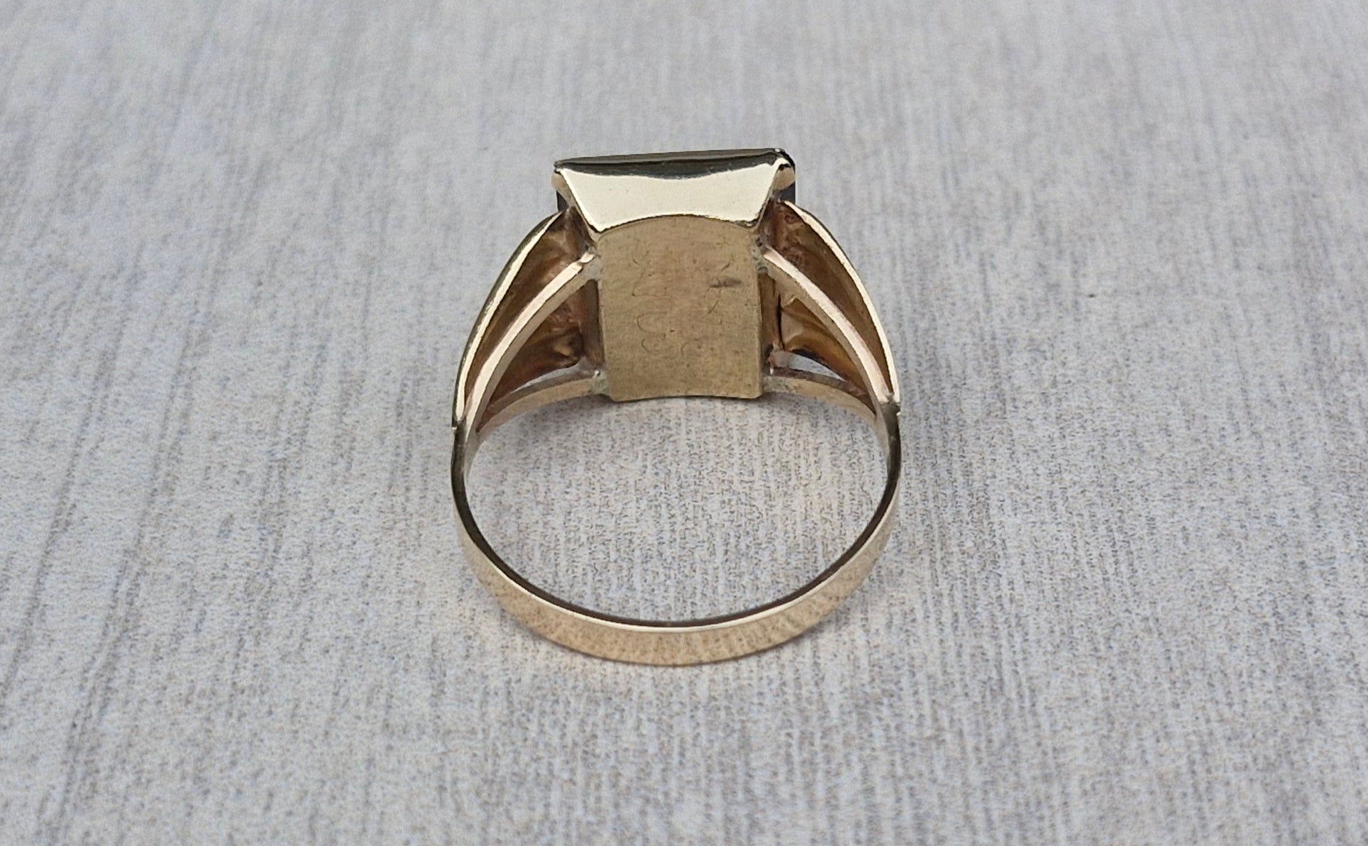 This is a 9ct yellow gold ring featuring a rectangle onyx measuring around 13mm x 12mm. The onyx is set between retro designed shoulders, adding character to the ring.