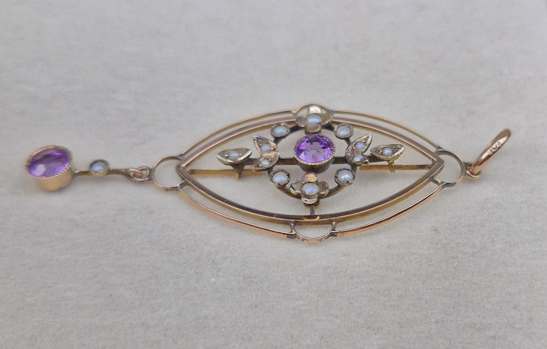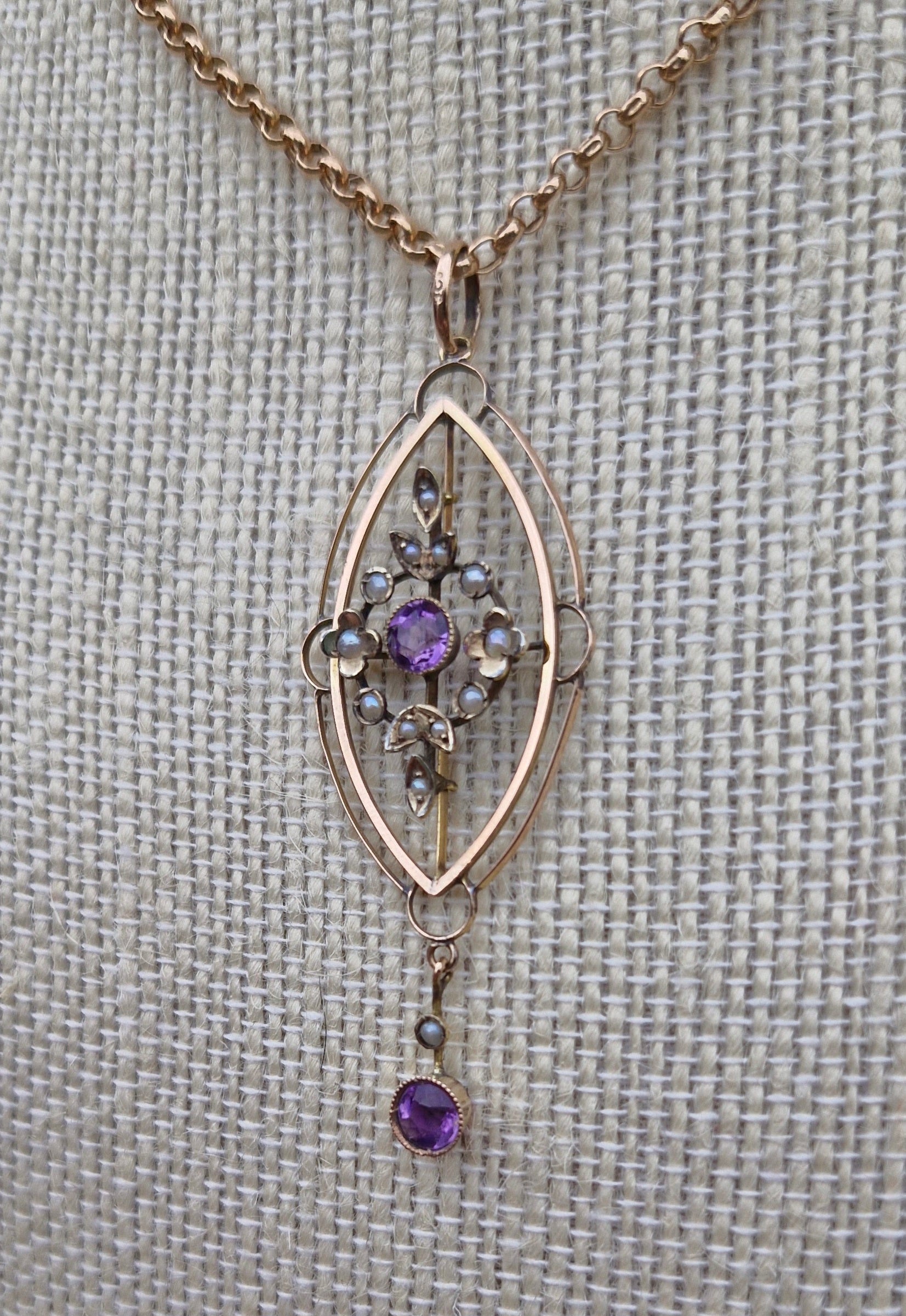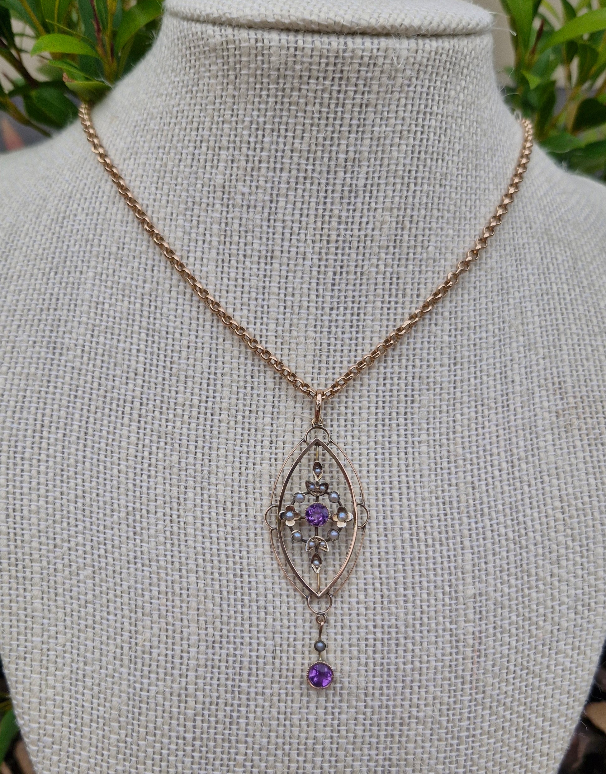 Newly listed is this beautiful antique 9ct rosey gold pendant. The pendant features a brilliant cut, purple stone and a floral motif inside an art nouveau style setting. The delicate flowers are adorned with seed pearls. A second purple stone is bezel set and suspended below.