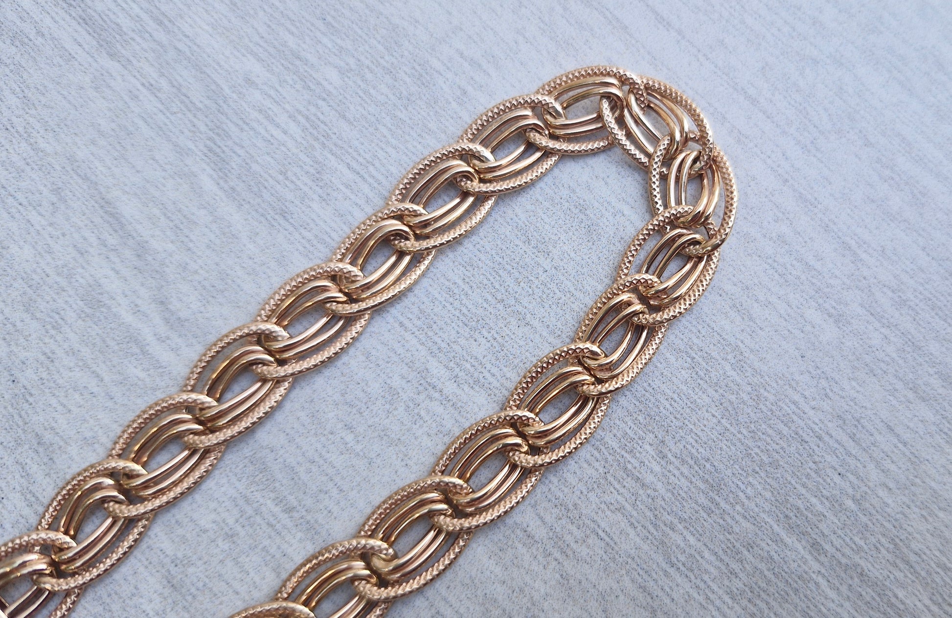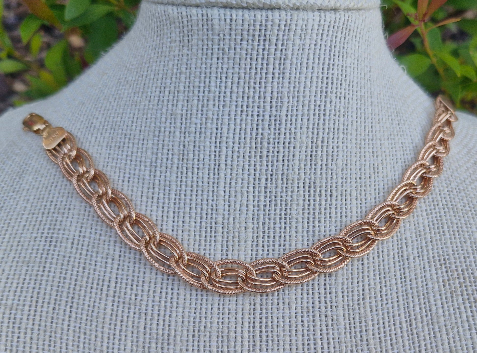 This 9ct gold bracelet is just divine! We love the hue of the rose gold and the combination of the plain double links against the textured outer links. The parrot clasp is a large, solid size and the length of the bracelet is 20cms.