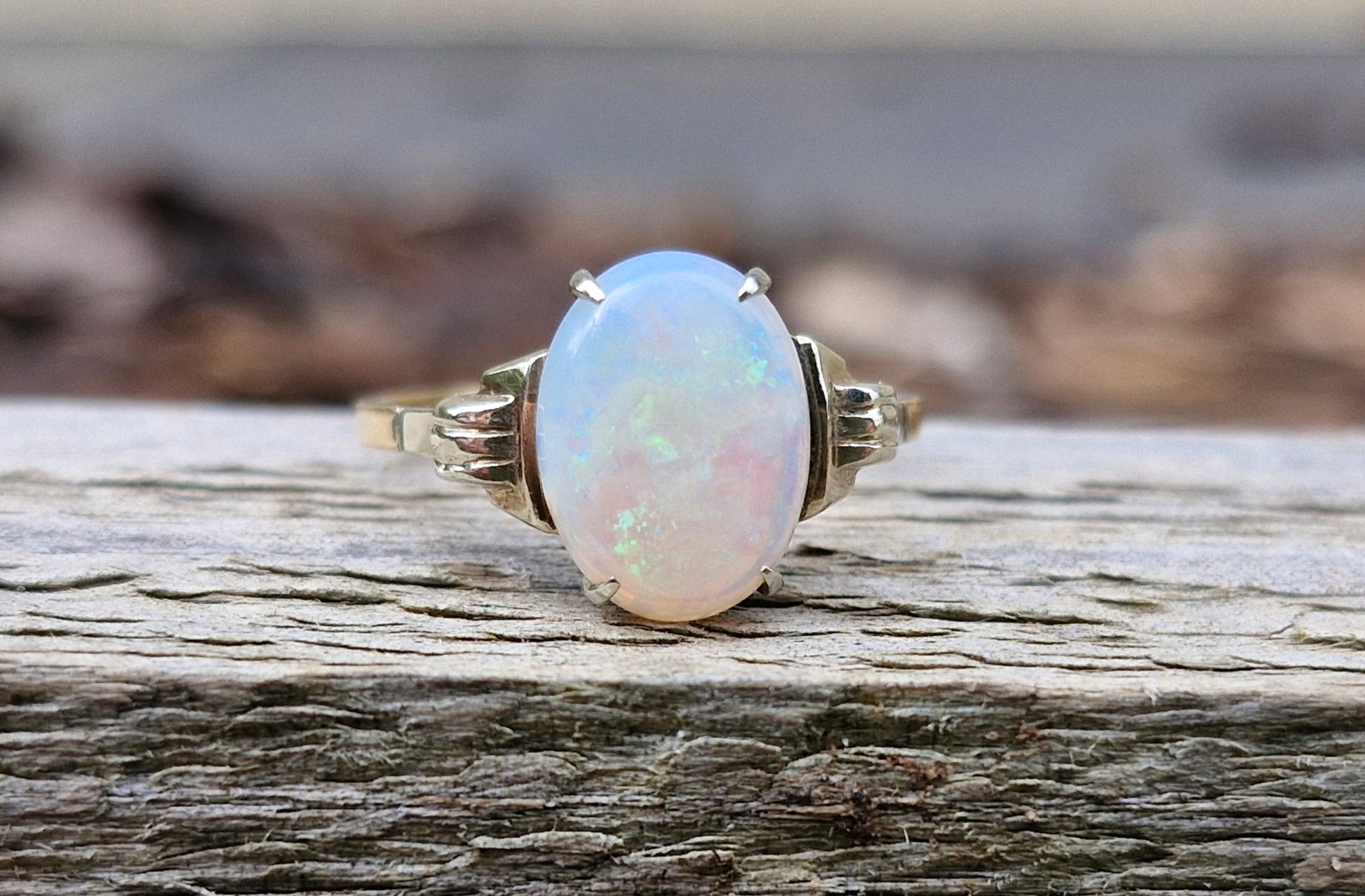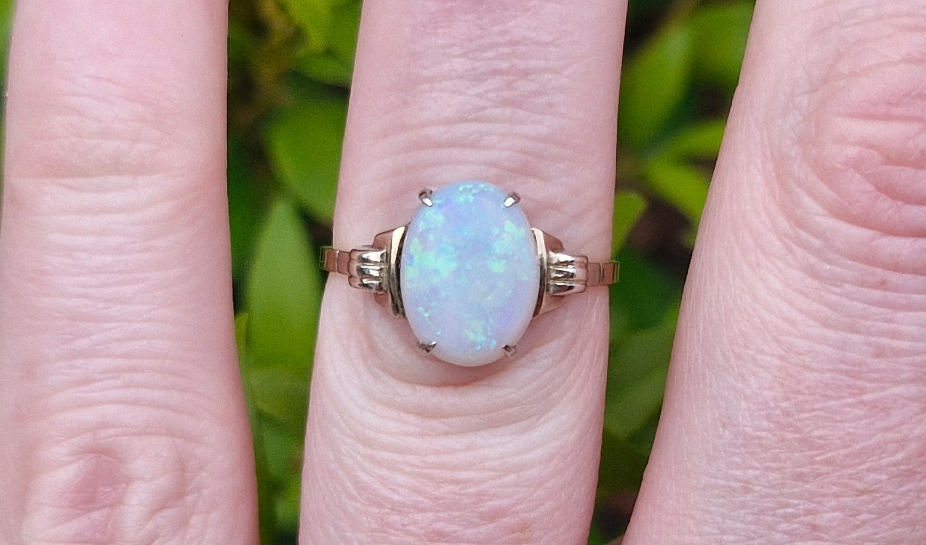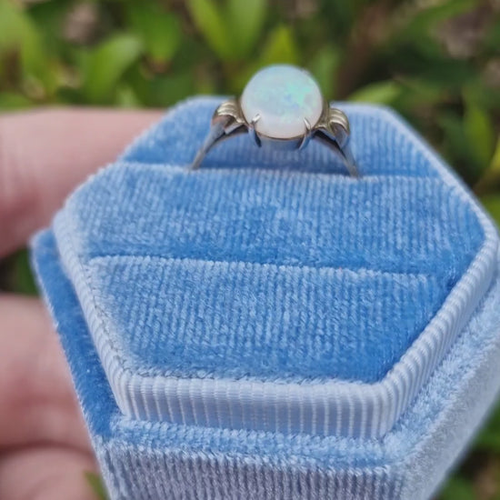 This elegant 9ct gold ring showcases a polished white cabochon opal (10mm x 6mm) in a four-claw white gold setting. Raised tapered shoulders lead to a slim, flat 9ct yellow gold band. The opal displays a subtle spectrum of colours. We don't know too much about opals, so we are unsure if this opal is natural or created.