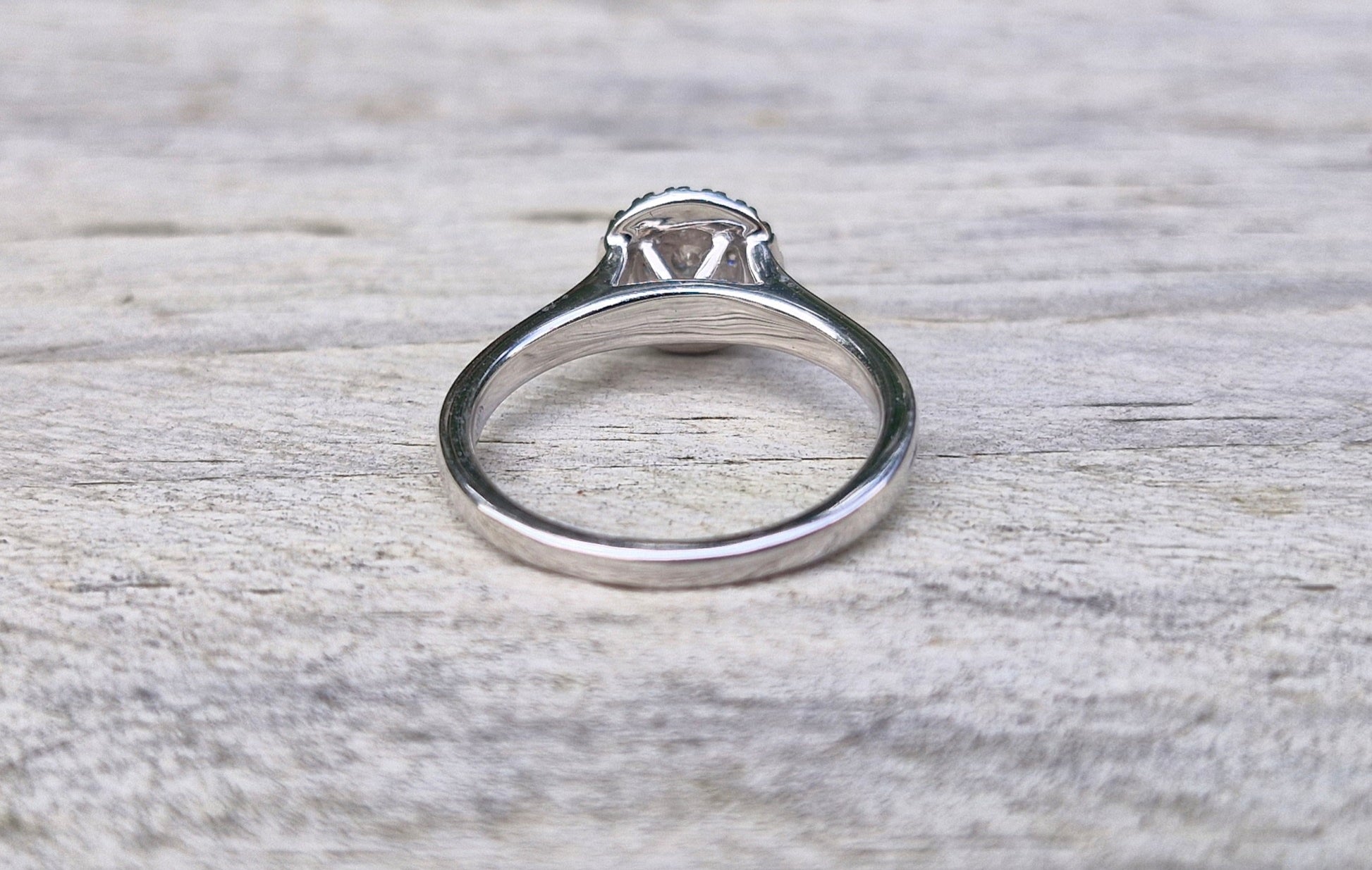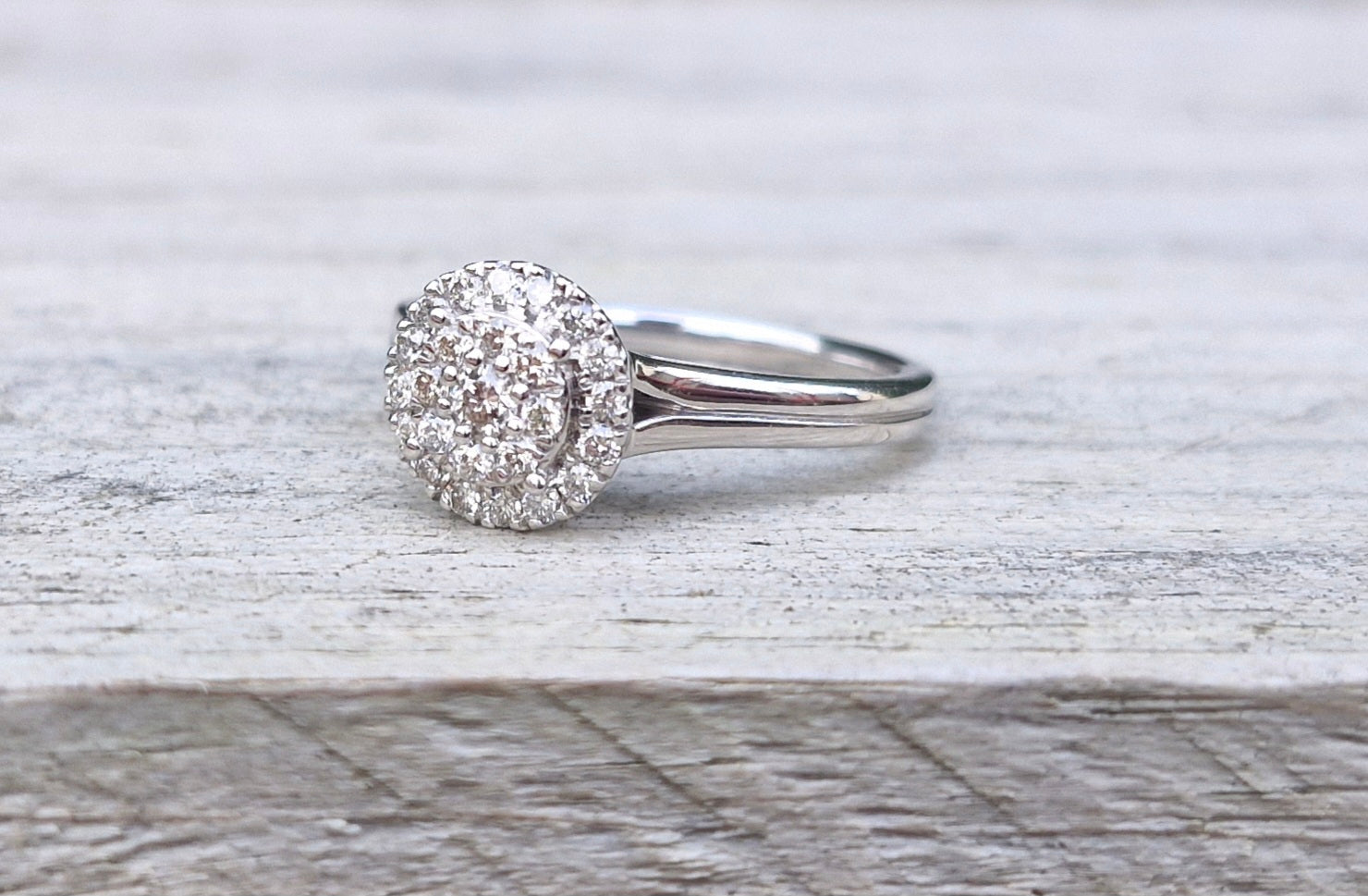 A modern and very popular design; this ring would be a perfect engagement ring or can simply be worn as a daily dress ring. It is 9ct white gold and has a central diamond cluster surrounded by a diamond halo. These genuine diamonds are brilliant cut and sparkle beautifully in the sunshine. The height of the first tier allows this ring to fit snug against a band.