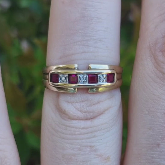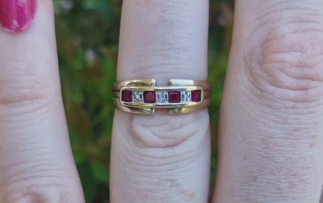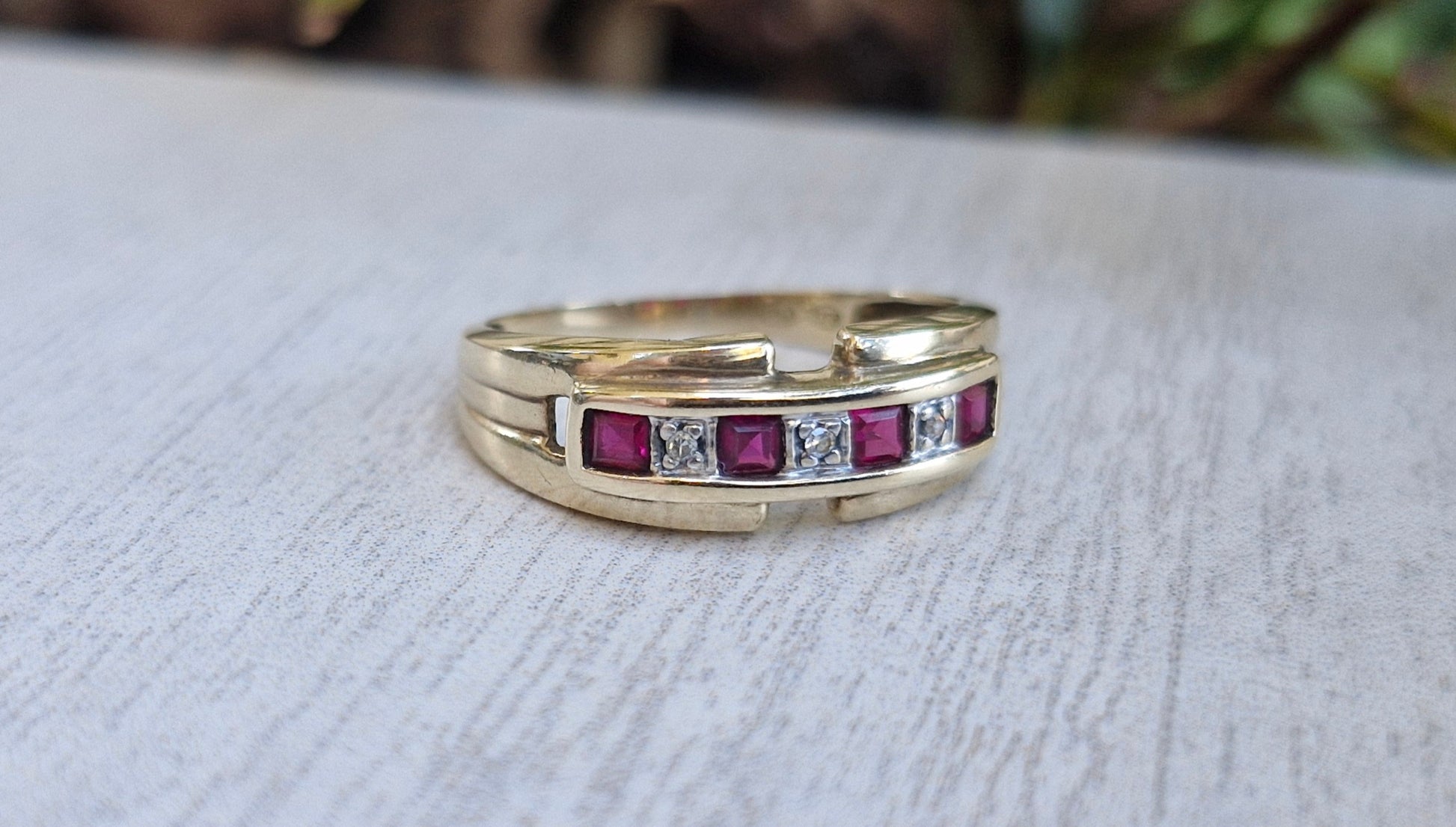 This 9ct yellow gold ring has a slightly elevated channel setting with x3 brilliant cut, bead set diamonds and x4 princess cut, created rubies. The rubies are a glorious red colour and measure approximately 2mm each.