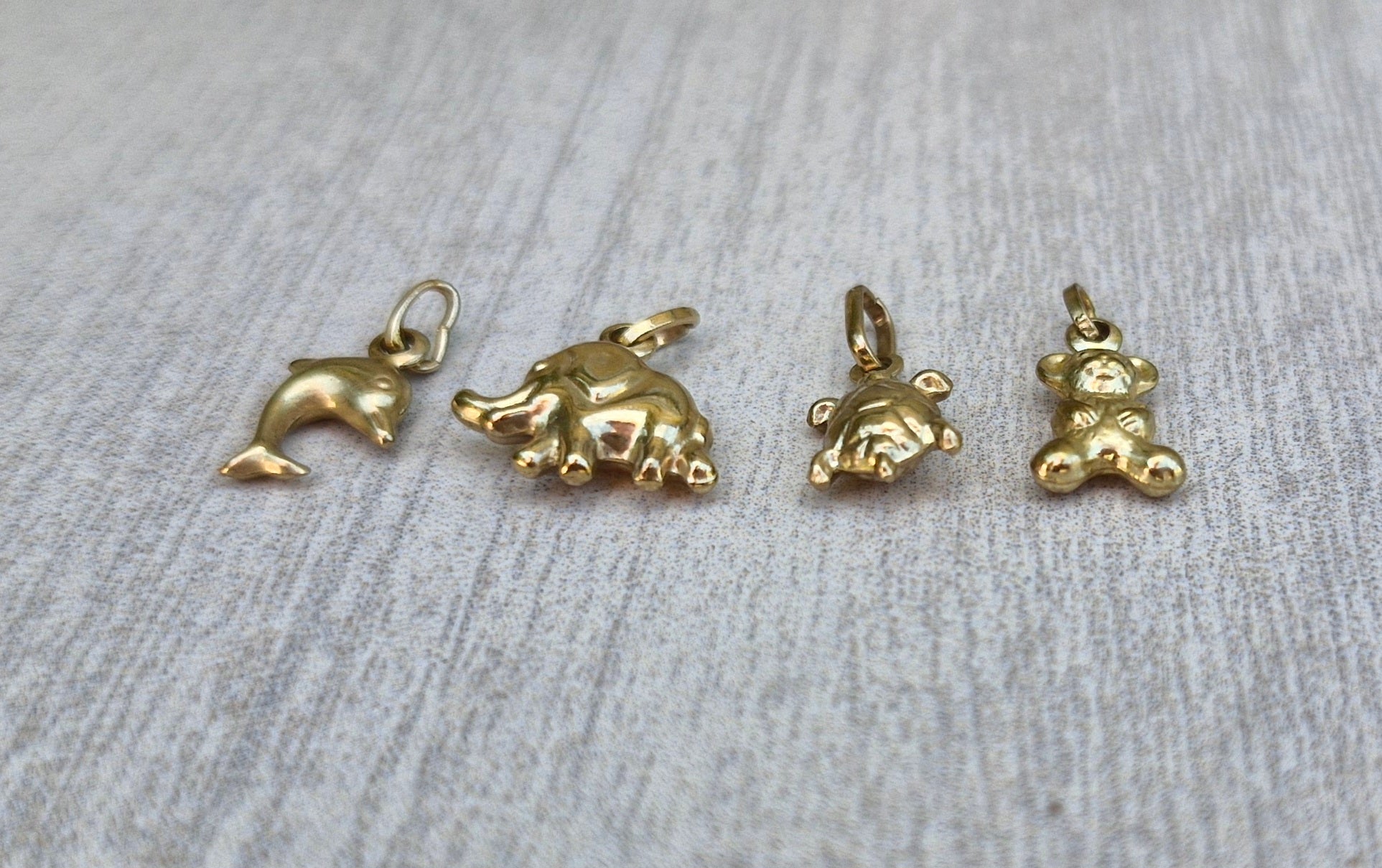 This listing includes four super sweet 9ct yellow gold charms: a dolphin, teddy bear, turtle, and an elephant. Each charm has a closed bail and a delicate, detailed finish. The charms are small in size - for example, the teddy bear measures approximately 9mm x 4mm - ideal for charm bracelets or fine chains.