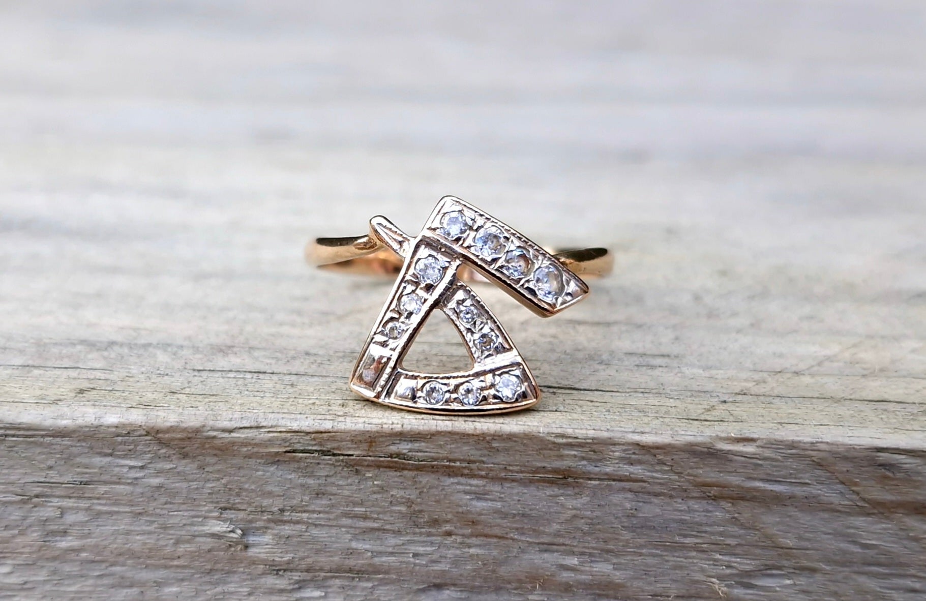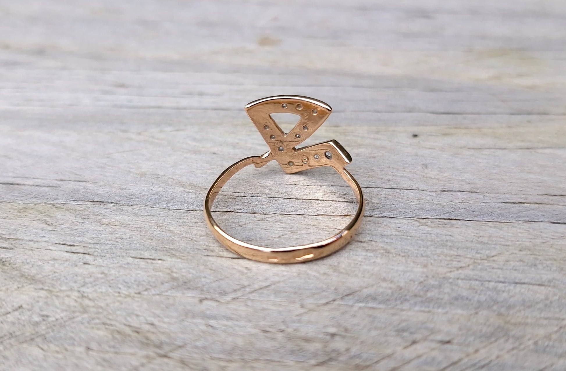 This modern 14ct rose gold ring is quite possibly European given the hallmarks are on the outer shank, as opposed to the inner shank as we typically find. The geometric design provides some finger coverage but it also has a very low profile, making it comfortable for everyday wear.