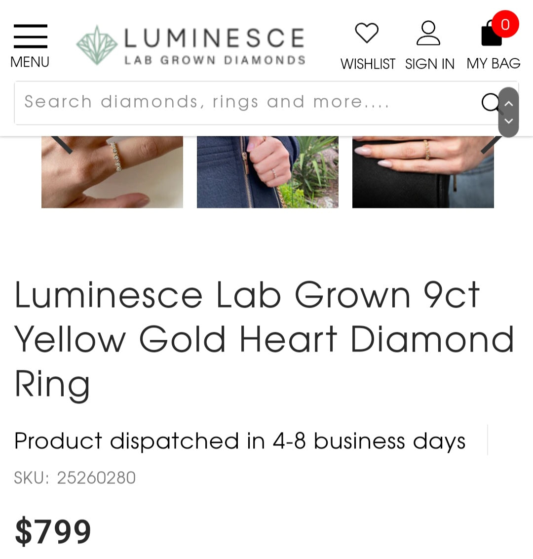 This ring originates from Luminesce, an Australian owned company specialising in lab grown diamonds. Lab grown diamonds look indistinguishable from natural diamonds. They share the same physical, optical and chemical characteristics as natural earth mined diamonds and are often seen as an eco-friendly friendly choice.