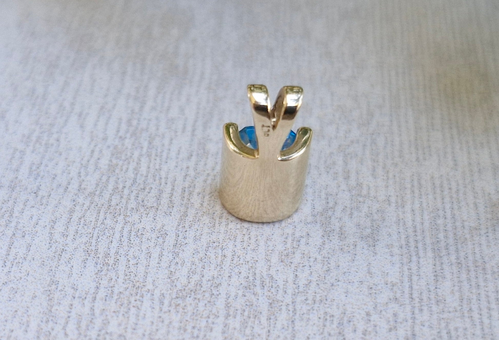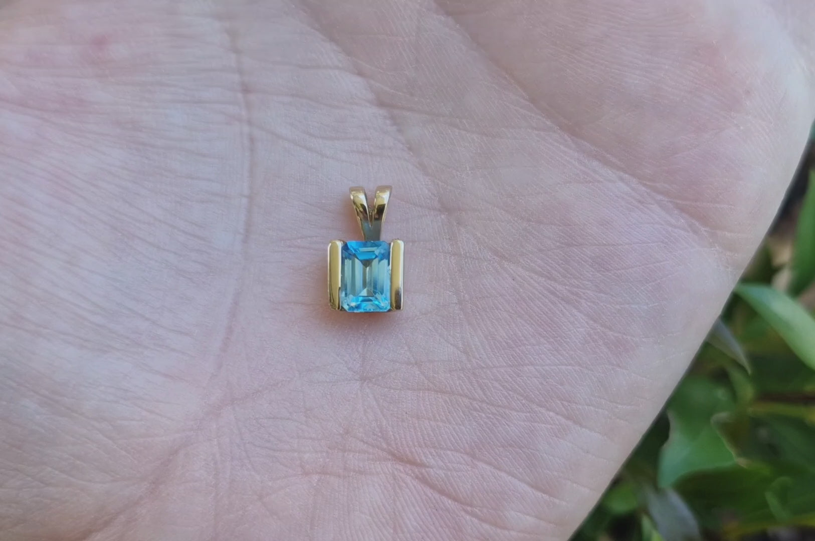 This pendant has a bright light blue topaz, which is rectangle cut and set in a half-barrel. The 9ct gold is nicely chunky for a little pendant and the bale is sturdy. Please note, this listing is for the pendant only, and does not include the chain.