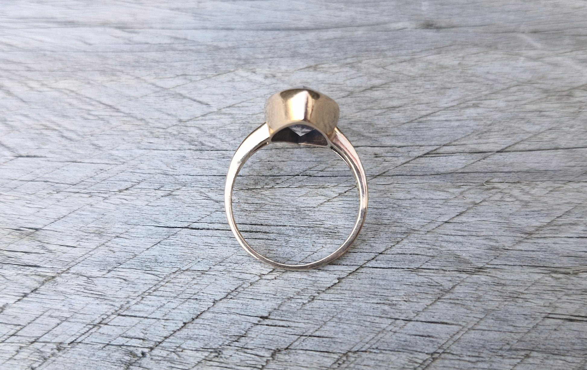 We love the shape of this navette ring and the finger coverage it provides. The colour of the stone is a light silvered lilac which is stunning against the 9ct rose gold. The back of the stone has beautiful facets which glisten through. The stone is secured in a bezel setting with an adjourning split shoulder design, balancing out the size of the stone. The stone tests as an amethyst but we have been unable to determine if it is natural or man-made. The stone measures 18mm x 9.5mm.