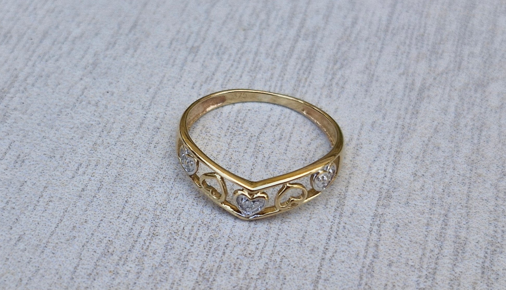 This 9ct yellow gold ring features interchanging heart motifs accented with white gold highlights. The central heart is set with a small diamond chip.