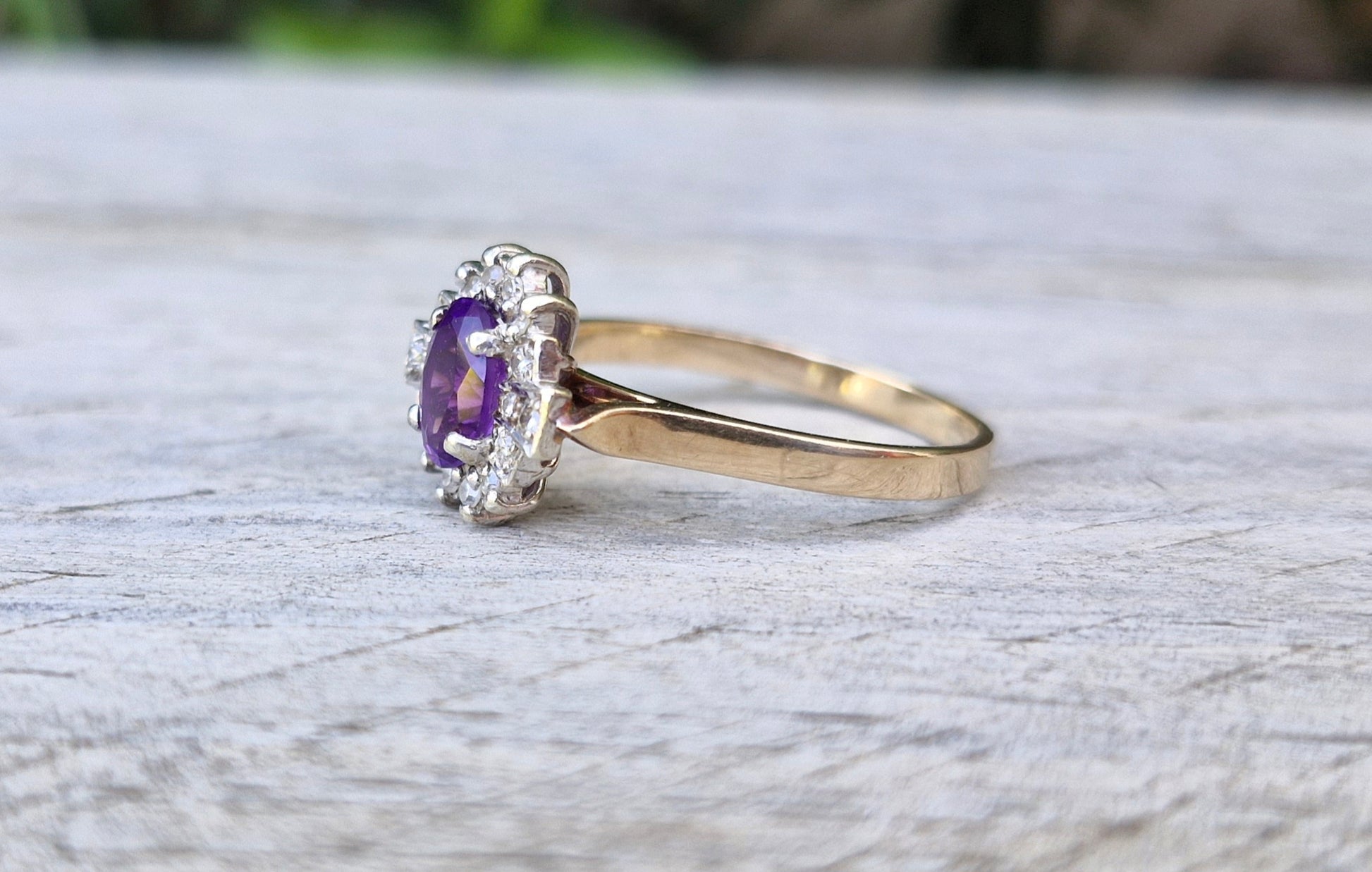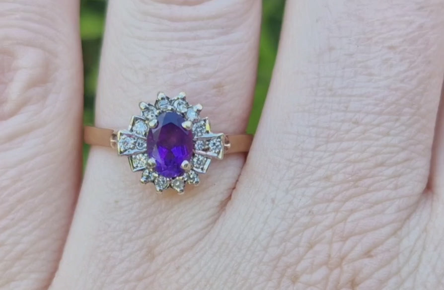Vintage 9ct Gold Amethyst & Diamond Ring - Size R