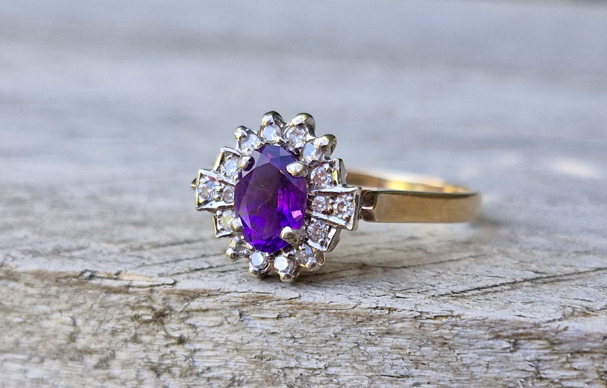 This fabulous vintage ring has an oval cut, vibrant purple amethyst. The stone measures approximately 6mm x 4mm. Surrounding the amethyst is a diamond halo. Our favourite thing about this ring is the art deco flair of the halo and the wide wire claw basket which houses the stones.